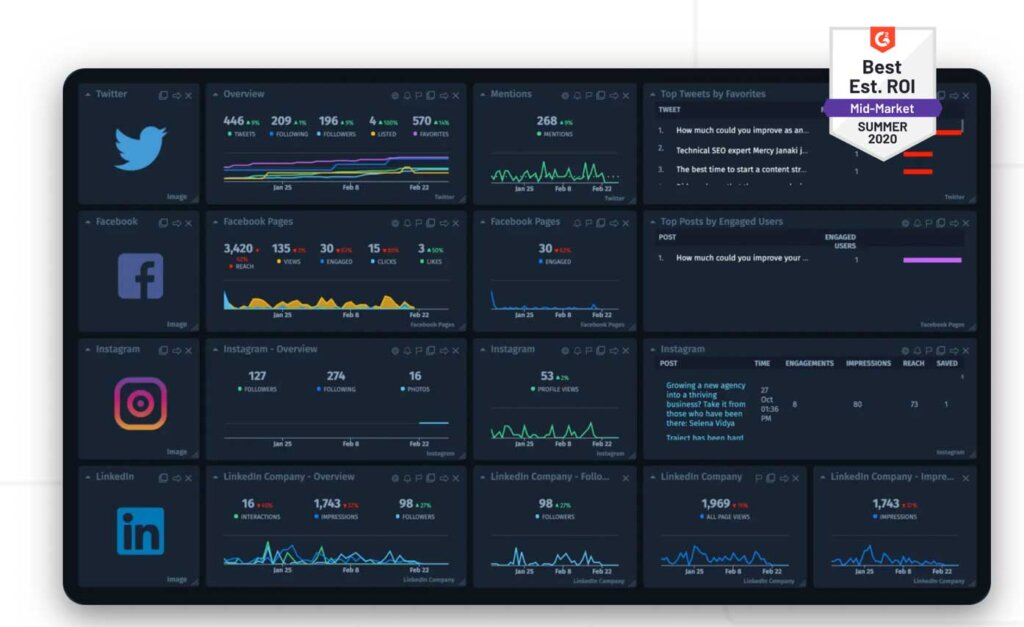 Cyfe ist ein Online-Dashboard, das alle Marketingkanäle, die Webanalyse, die Finanzen, den Vertrieb und die sozialen Medien zusammenführt. Es sieht ähnlich aus wie die Geckoboard-Plattform. Das Tool ist kostenlos, wenn Sie maximal fünf verschiedene Dashboards verwenden. Die Dashboards können mit allen geteilt werden, auch mit Ihrem Team und Ihren Kunden. Datenberichte werden automatisch in den Formaten PNG, JPEG, PDF und CSV versendet. Der einzige Nachteil von Cyfe ist, dass Sie wenig Variation im Panel-Design haben. Zusätzlich zur kostenlosen Option gibt es eine „Premium“-Version, die nur 19 Dollar pro Monat kostet. Mit diesem Premium-Konto können Sie eine unbegrenzte Anzahl von Dashboards, Widgets und Benutzern hinzufügen.