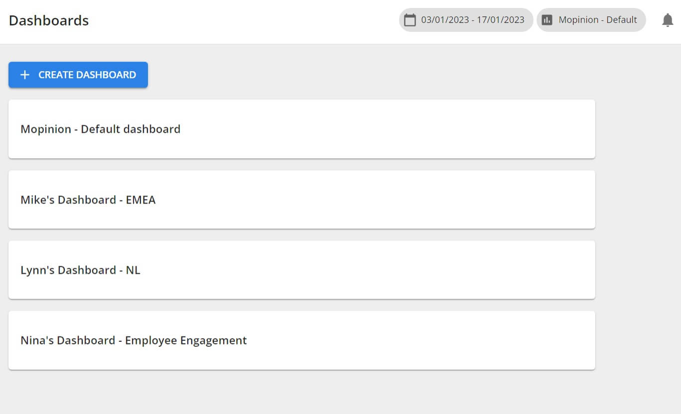 In Mopinion zie je een nieuwe sectie onder ‘Dashboards’, waar alle dashboards voor het selecteerde report staan.