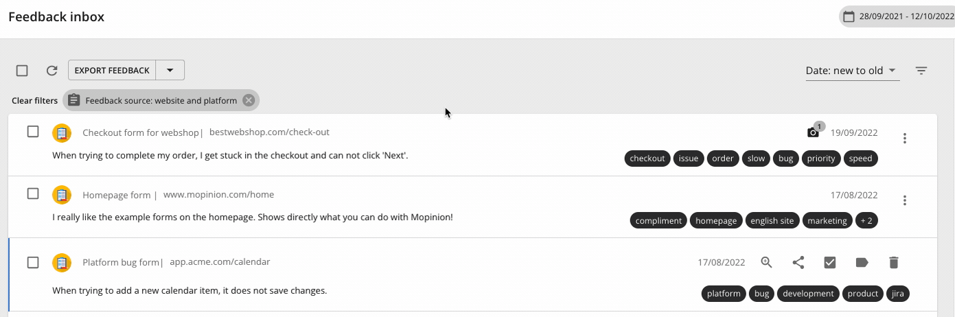 Zonder user feedback, heeft het geen zin iets aan de user experience te veranderen, want je hebt  geen flauw idee van wat er verbeterd moet worden. Bij Mopinion streven ook altijd naar de optimale UX, dus hebben we pas de UX van de overzichtspagina van de feedbackinbox verbeterd. Je kunt nu nog sneller de binnengekomen feedback scannen. Dankzij jullie feedback wisten we hoe we het design konden aanpassen om zo de user experience te verbeteren.