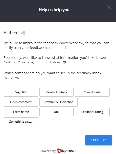 Hoe konden we jullie behoeften meenemen in het design van de feedback inbox? Je raadt het vast al, met een Mopinion feedbackformulier natuurlijk.