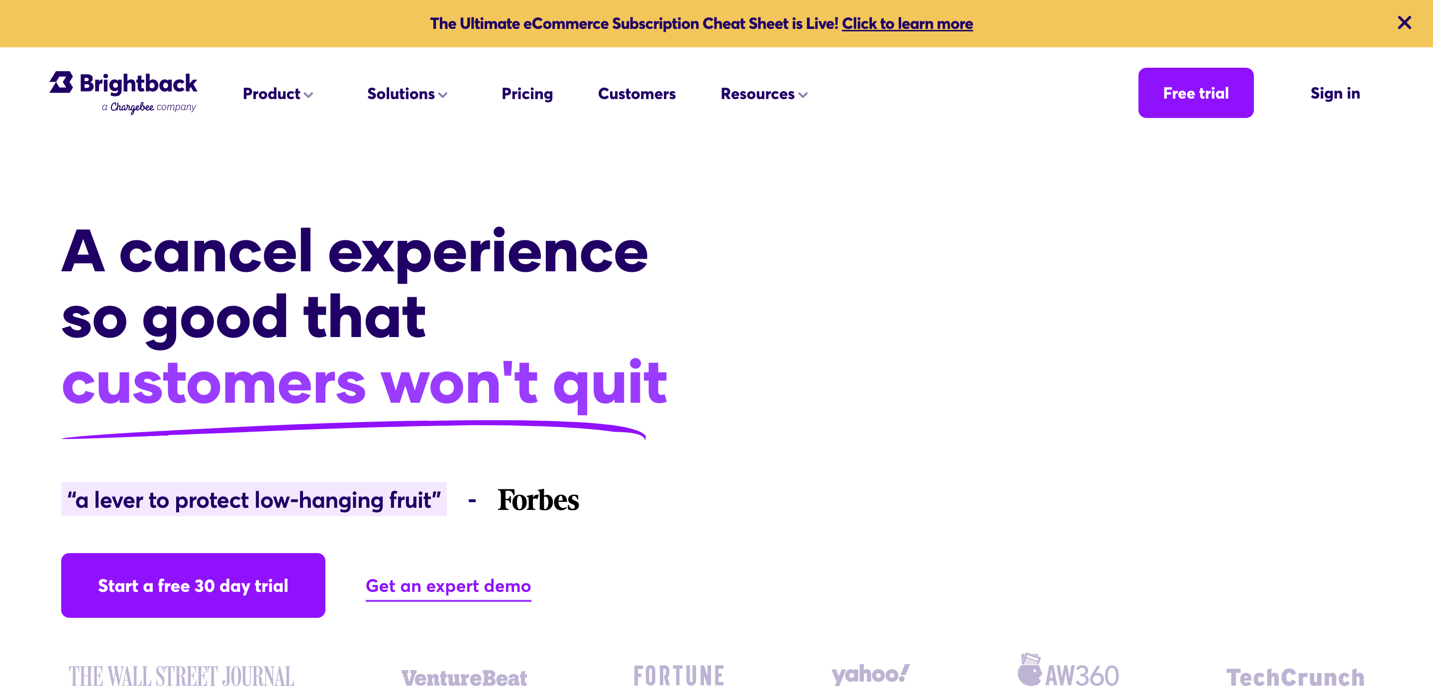 Brightback (a Chargebee company) is a customer retention automation software that serves customer success as well as product management initiatives. Using a tailored cancel page, this tool enables users to learn more about why their customers churn. The page – personalised using segmentation – gathers insights into customer behaviour, including real-time alerts when a customer cancels.